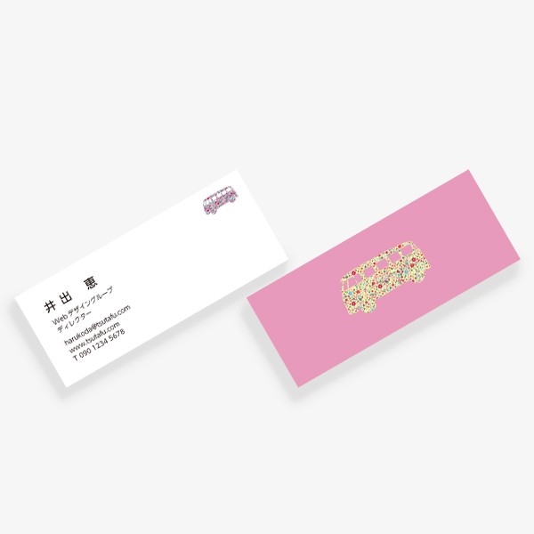 夏をイメージした車のシルエットに、夏に咲く花と夏のモチーフをサマーカラーで描いた花柄模様をつめ込んだ名刺デザイン。裏面は全面絵柄のデザインです。