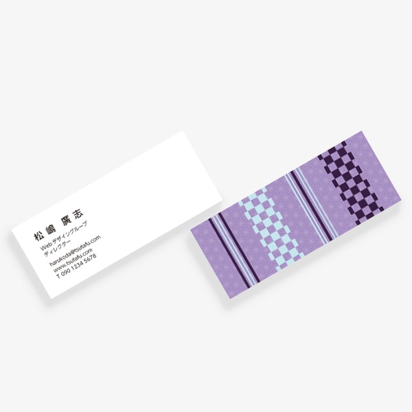 日本の伝統色「竜胆」をベースカラーに、日本の伝統文様のひとつ「市松」文様をデザインした名刺。市松は、ベビーブルーと茄子紺色をアクセントカラーとして使用。また、全面に「麻の葉」文様が描かれており、パステル調の色合いがやさしげな名刺デザインです。
