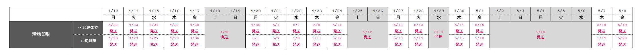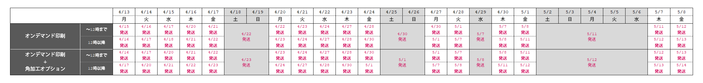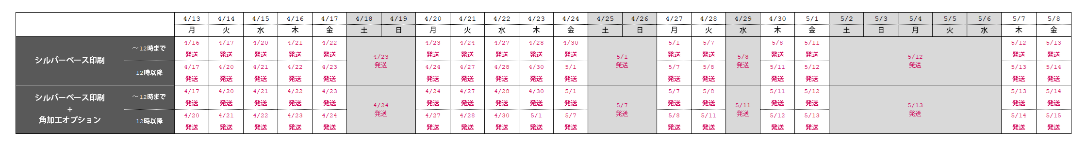 ゴールデンウィーク期間中は商品の発送サイクルが異なります。